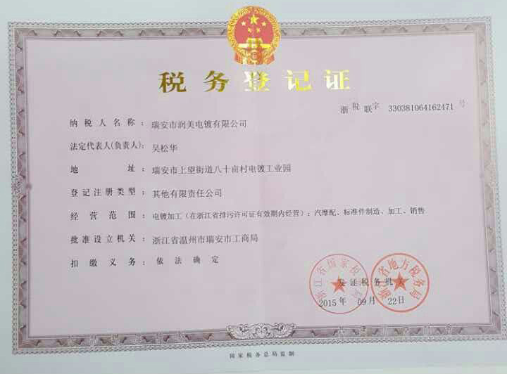 瑞美電鍍稅務(wù)登記證